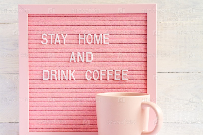 Розовая кофейная чашка и кут Оставайтесь дома и пейте кофе Кампания по самоизоляции и карантину для защиты себя и спасения жизней