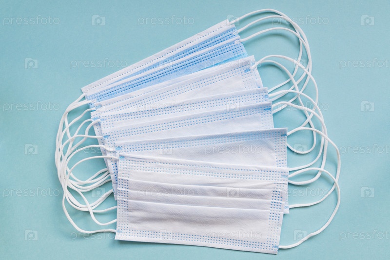 Медицинские маски на синем фоне с копией пространства. концепция гигиенического карантина. Плоская планировка, вид сверху
