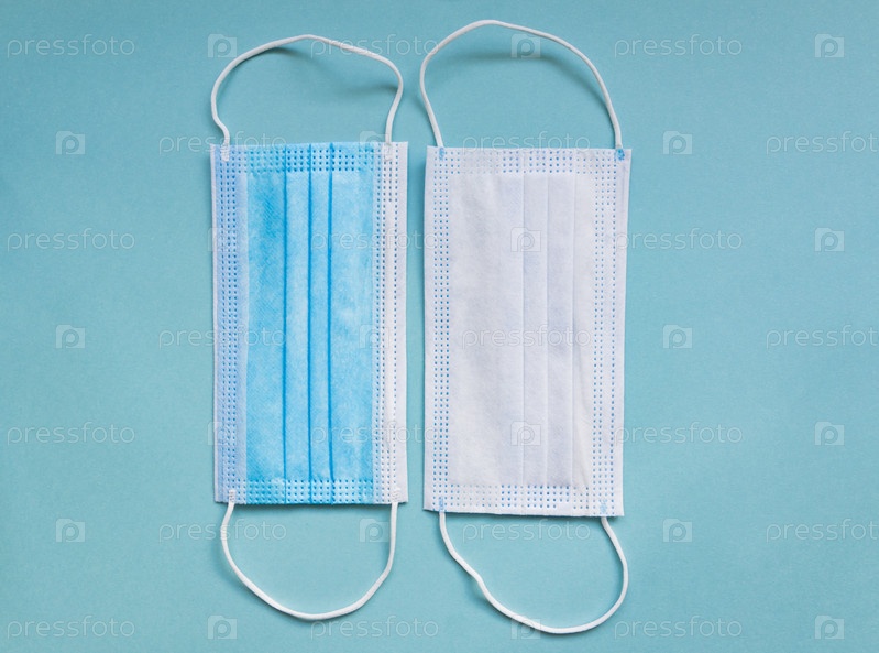 Две стороны медицинской маски на зеленом фоне с копировальным пространством. концепция гигиенического карантина. Плоская планировка, вид сверху