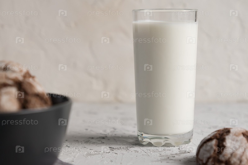 Стакан молока с шоколадным печеньем на сером фоне