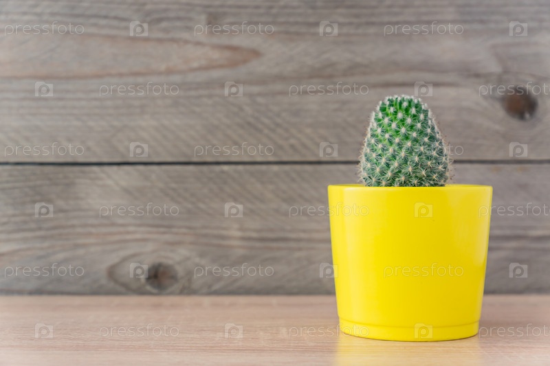 Крупный план кактуса маммиллярии в желтом керамическом горшке на деревянном фоне. Домашнее садоводство, место для копирования текста