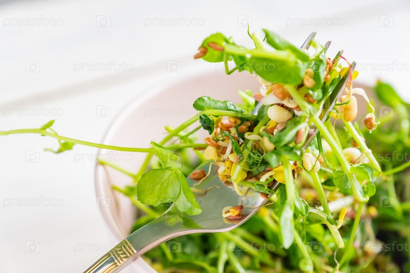 Закройте салат из ростков микрозелени гороха и проросшей фасоли. веганская здоровая пища