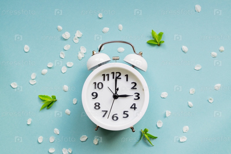 Белый будильник на синем фоне с лепестками вишневого цветка и листьями. Весенний пакет
