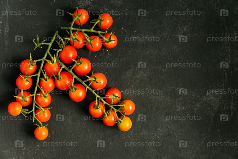 Вид сверху на свежие спелые помидоры черри на черном фоне с копировальным пространством. Ингредиент для средиземноморской кухни