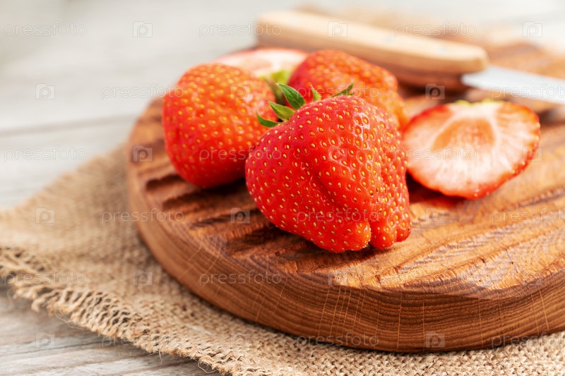 свежей спелой клубники на разделочной доске. Органические ранние летние фрукты и ягоды