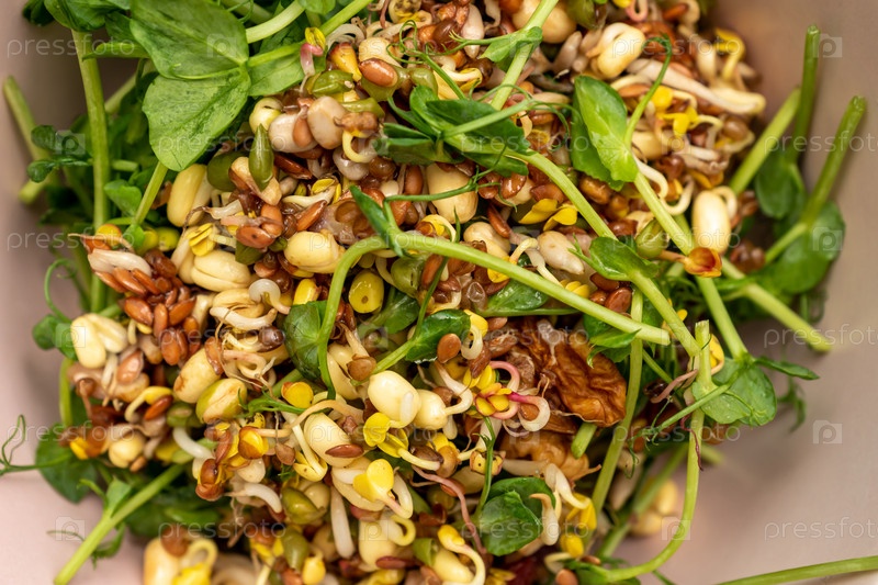 Веганский здоровый салат из ростков микрозелени гороха и проросшей фасоли, пищевой фон