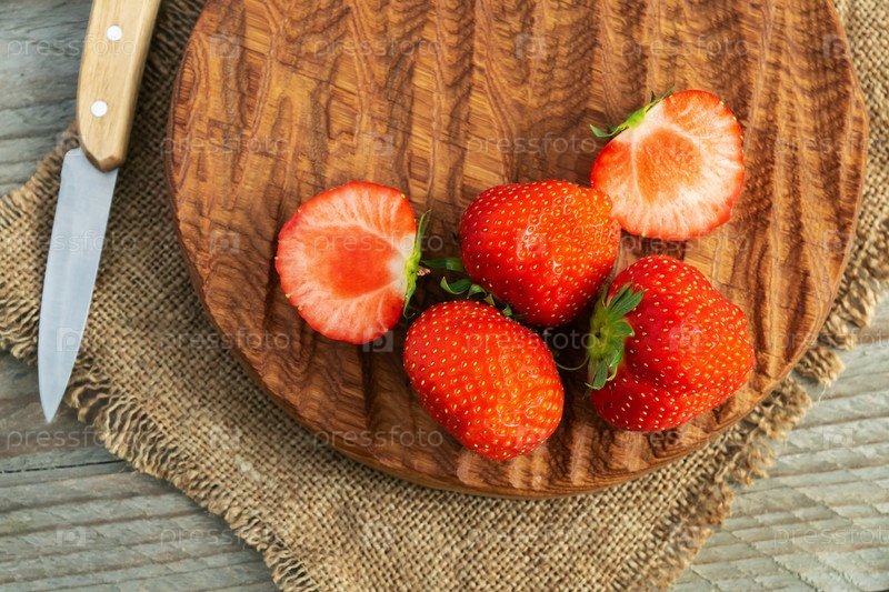 Клубника на деревянной разделочной доске над салфеткой из мешковины и серым деревянным фоном