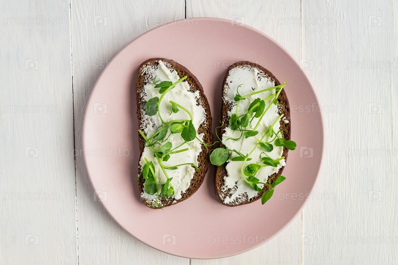 Диетический фитнес-тост со сливочным сыром и ростками микрозелени гороха на белом, вид сверху