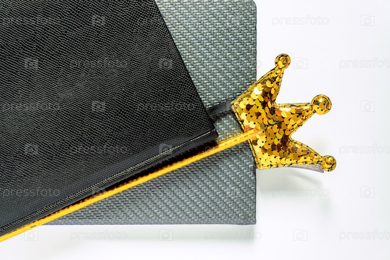 Пара личных планировщиков и чудо-палка с золотой короной из блесток на белом фоне