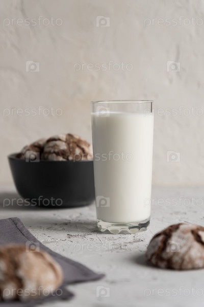 Закройте стакан молока с хрустящим шоколадным печеньем. Вкусный перекус или завтрак