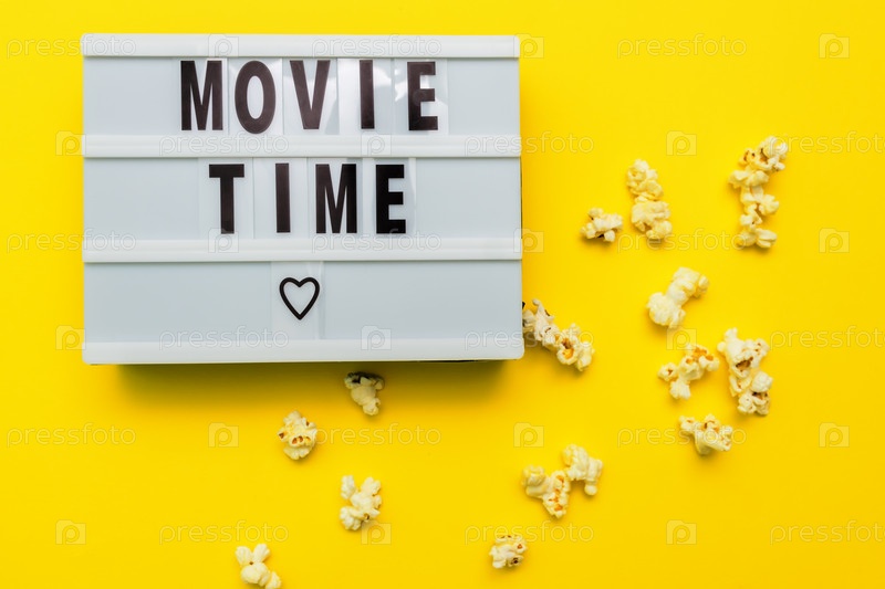 Текст Movie Time на световой коробке. рассеянный соленый попконн на желтом фоне