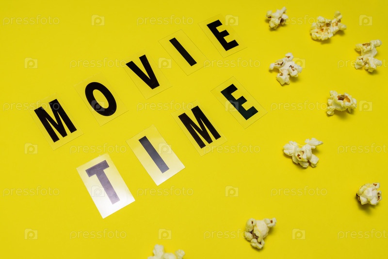 Надпись "Время кино" с разбросанным соленым попкорном на желтом фоне