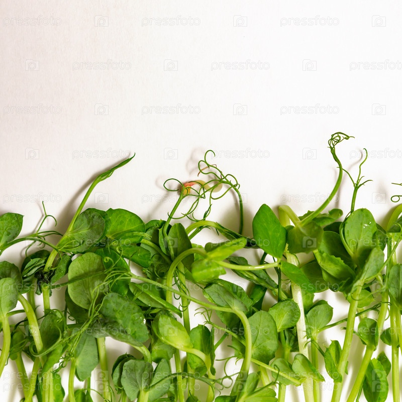 Куча органических свежесобранных ростков снежного гороха на белом фоне, скопируйте место для текста