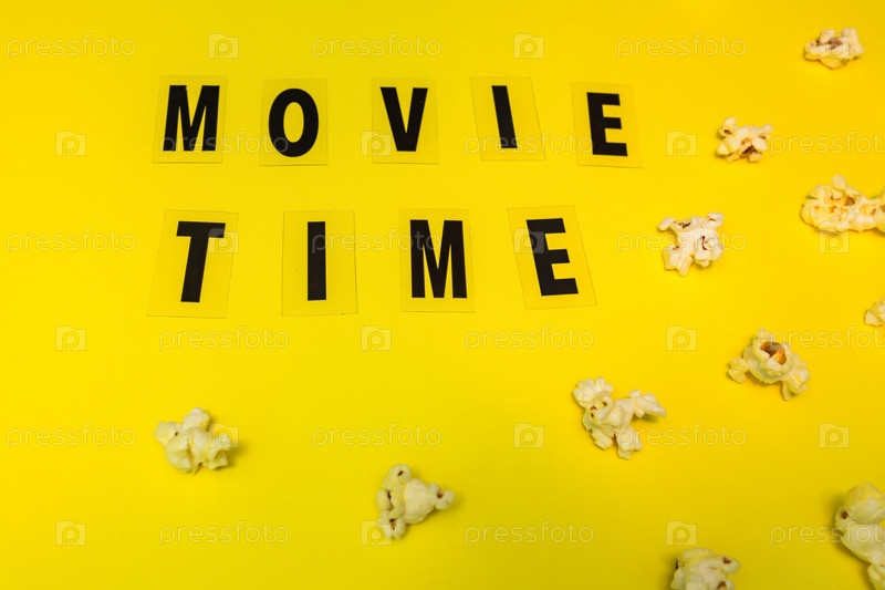 Время попкорна и текстового фильма на фоне желтой бумаги. Концепция кино и развлечений. Плоская планировка