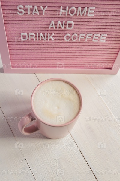 Розовая кофейная чашка и кут Оставайтесь дома и пейте кофе Кампания по самоизоляции и карантину для защиты себя