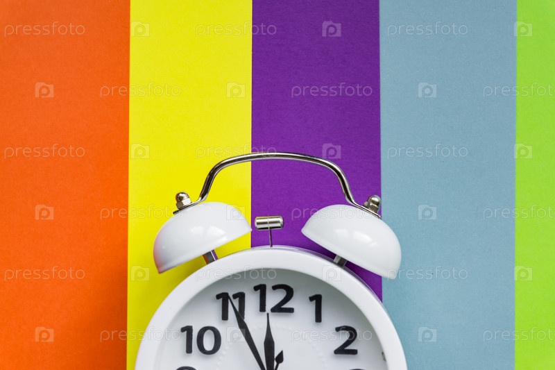 Белый будильник на разноцветном полосатом фоне с копией пространства для текста