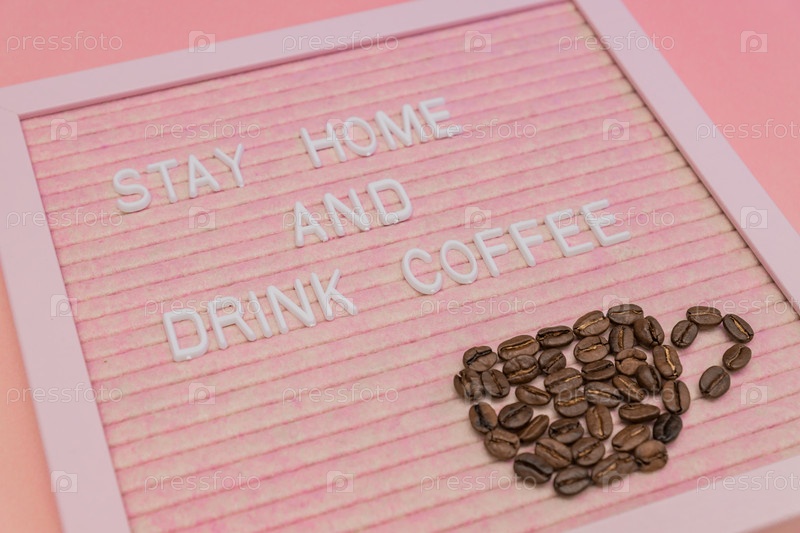 Цитата: оставайся дома и пей кофе на розовой декоративной доске. чашка из кофейных зерен. слоган профилактики covid-19