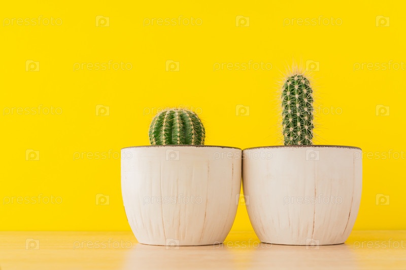 Коллекция кактусов в белом керамическом горшке на ярко-желтом фоне. Подходящий кактус для начинающих. Домашнее садоводство