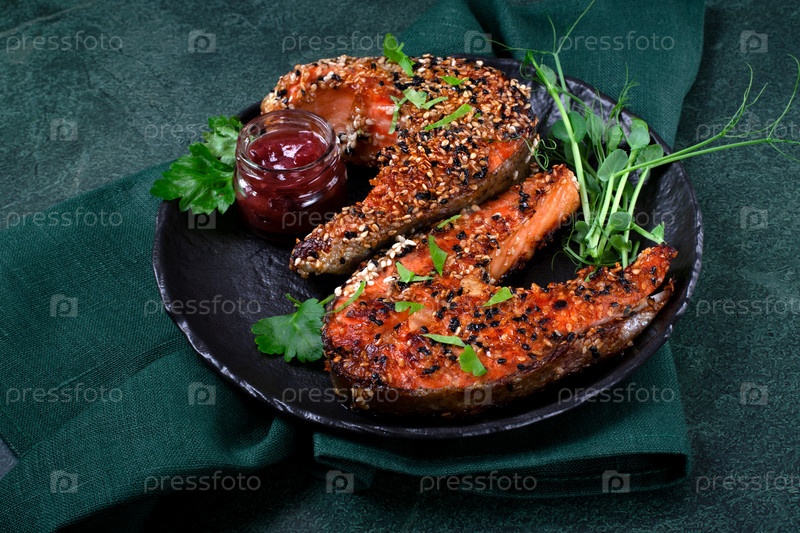 Жареный стейк из форели с кунжутом, брусничным соусом и микрозеленью зеленого горошка на темной тарелке