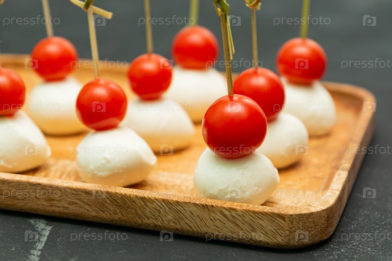 Пищевые закуски и закуски для фуршета. Канапе с сыром моцарелла и помидорами черри на деревянном подносе