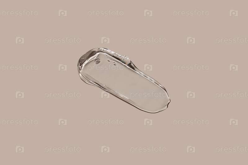 Мазок жидкого геля выделен на бежевом фоне. Косметические пятна, такие как чистый прозрачный лосьон с алоэ, желеобразная сыворотка для лица, очищающее средство, гель для душа или шампунь, вид сверху