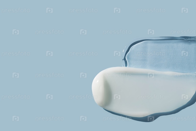 Белый крем и прозрачная гелевая текстура на синем фоне. косметический крем инсульт, гель для ухода за лицом. Кремовая основа или увлажняющий крем