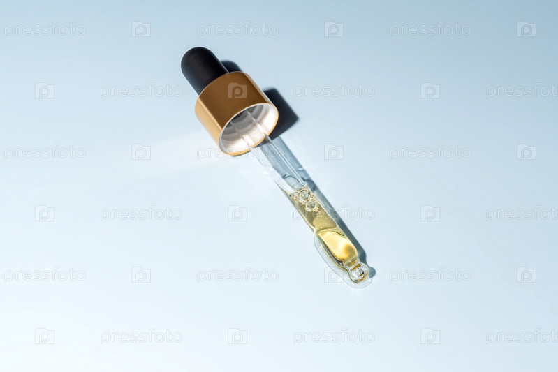 Масло для лица красоты капает из золотой капельницы на синем фоне. Реклама косметики по уходу за кожей с копией пространства