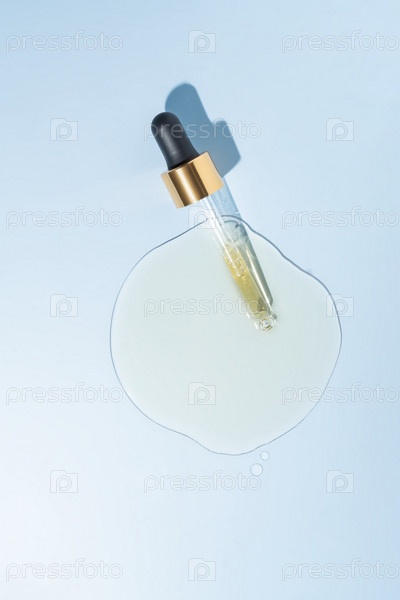 Закройте пипетку с заливкой жидкой сыворотки и тенями на синем фоне. Модная косметика с жесткими тенями