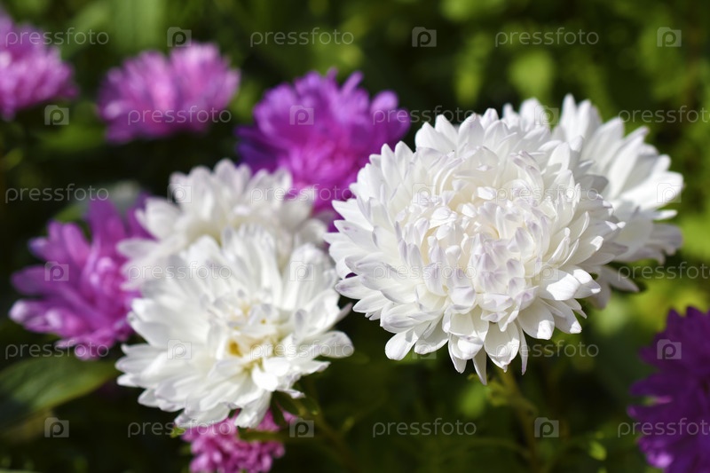 Красно-белые цветы астры сложноцветные в саду