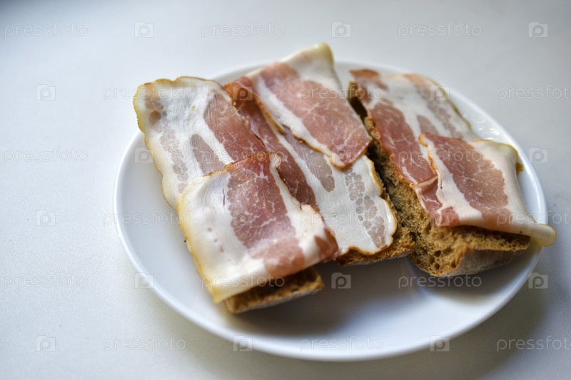 Свежий сочный бекон на кусочке ржаного хлеба