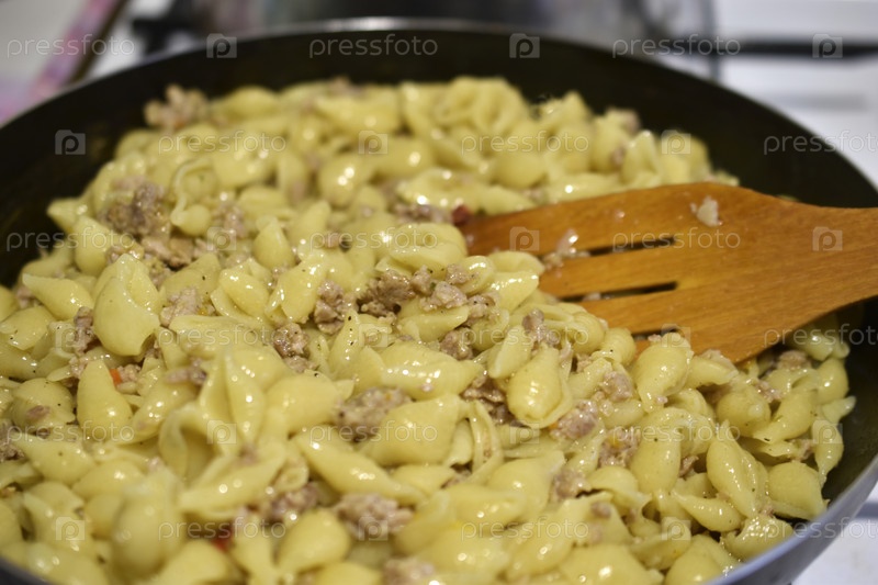 Свежеприготовленная паста по-флотски на кухне