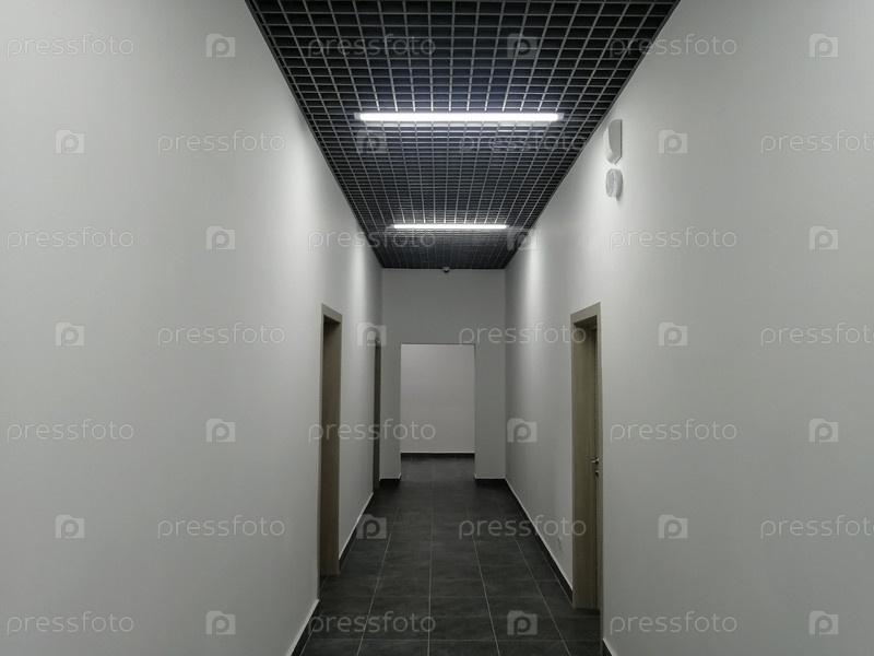 Новый офисный зал со свежим ремонтом стен, потолком и плиткой