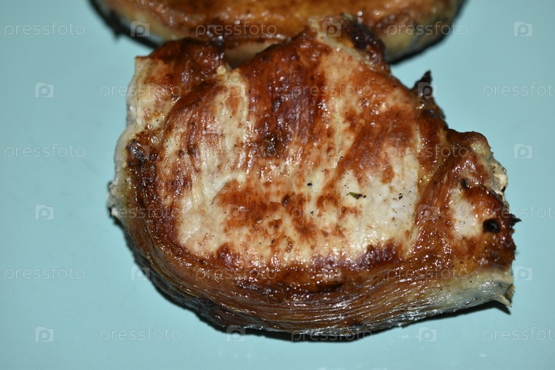 Куски вкусной жареной свинины на синей тарелке