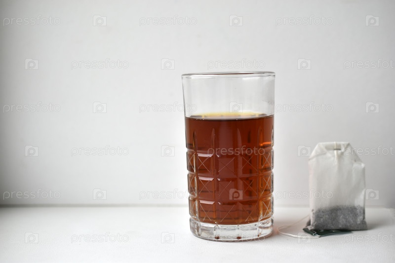 Стеклянная чашка с черным чаем и чайный пакетик на белом фоне