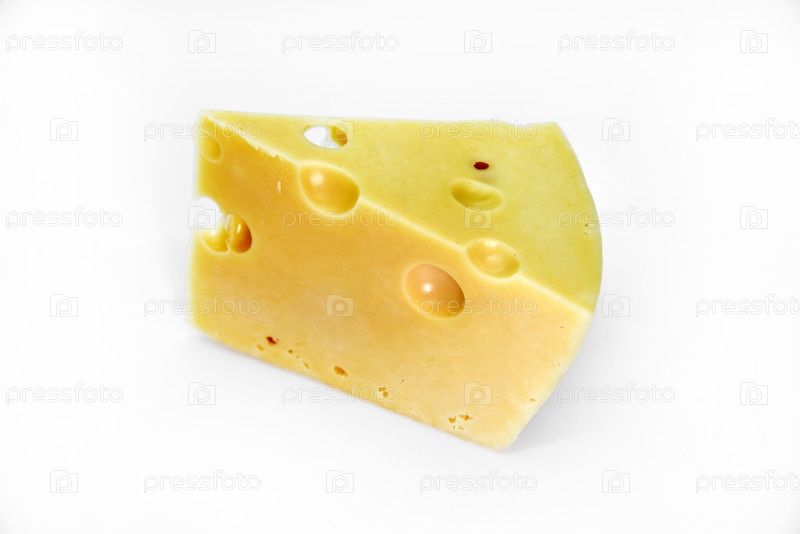 Большой кусок сыра на белом фоне. Треугольный кусок сыра с дырками