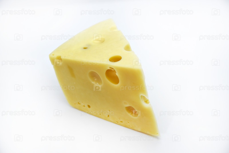 Большой кусок сыра на белом фоне. Треугольный кусок сыра с дырками