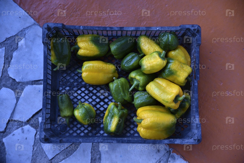 Желто-зеленые плоды перца в коробке. Крупные плоды перца. Сбор перца осенью
