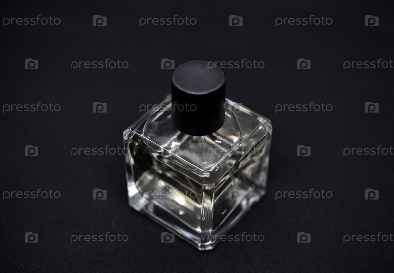 Стеклянный флакон духов на черном фоне. Флакон духов крупным планом. Парфюмерия