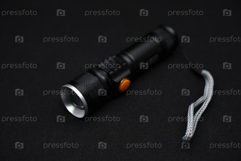 Металлический черный фонарик на черном фоне. Карманный фонарик