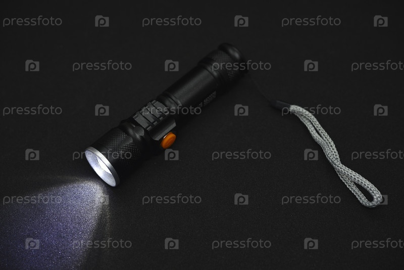 Металлический черный фонарик на черном фоне. Горящий карманный фонарик крупным планом. Осветительное устройство