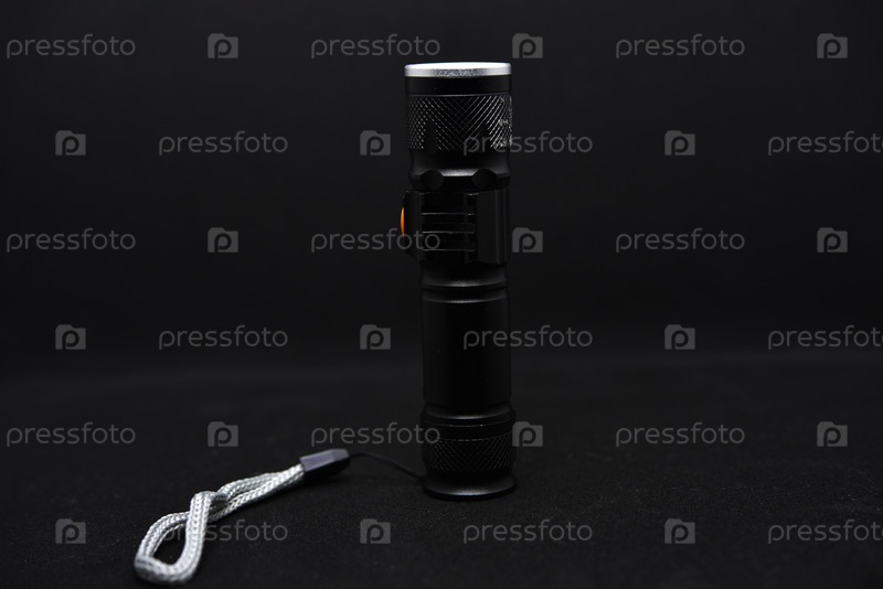 Металлический черный фонарик на черном фоне. Карманный фонарик