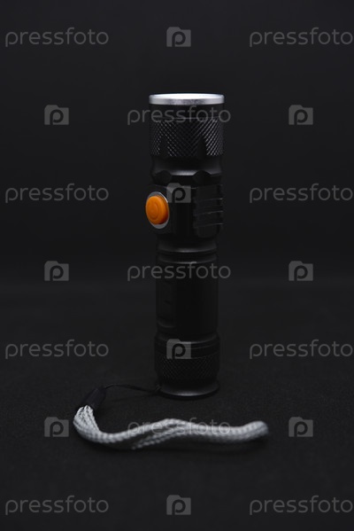 Металлический черный фонарик на черном фоне. Карманный фонарик