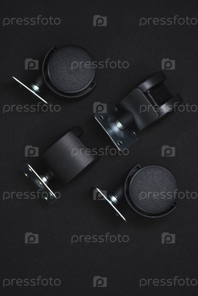 Черные пластиковые ролики для мебели на черном фоне