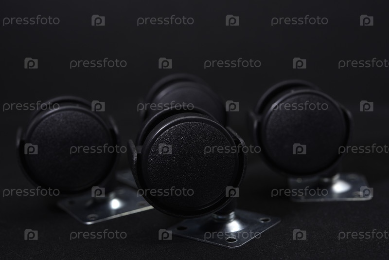Черные пластиковые ролики для мебели на черном фоне