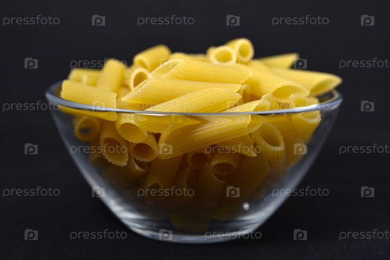 Макаронные изделия пшеницы в стеклянной миске на черном фоне. Сухие макароны в прозрачном контейнере