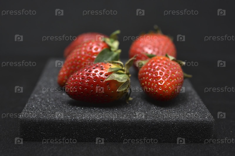 Крупная красная клубника на черной пластиковой подстилке. Красная клубника крупным планом
