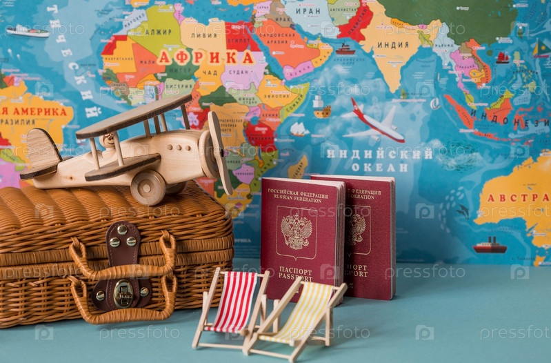 Туризм. Модель винтажного самолета, чемодан и российский паспорт на фоне карты мира. Концепция путешествия, приключений и открытий