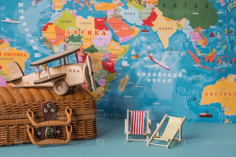 Туризм. Модель винтажного самолета, шезлонгов и чемодана на фоне карты мира. Концепция путешествия, приключений и открытий