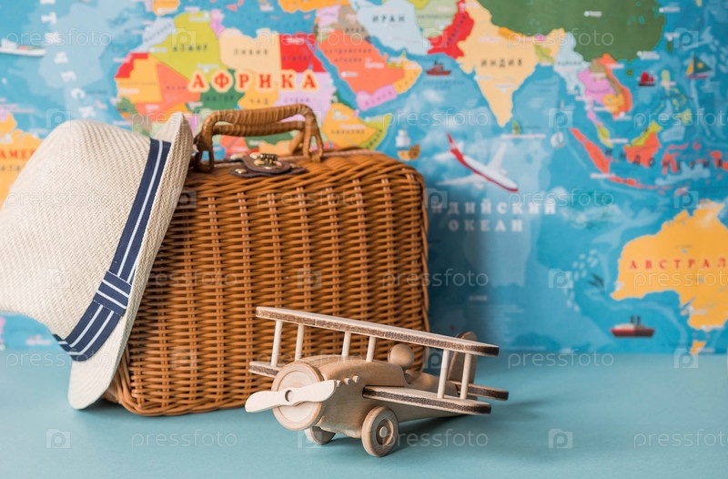 Туризм. Модель винтажного самолета и чемодан на фоне карты мира. Концепция путешествия, приключений и открытий