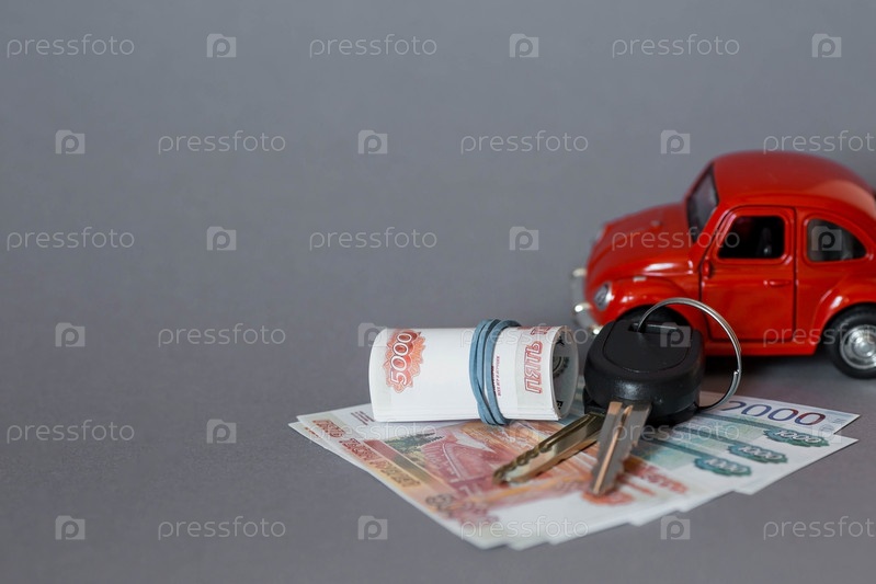 Автокредит. Покупка и аренда автомобиля. Красная машина, деньги и ключи от машины на сером фоне. Концепция покупки и страхования автомобиля